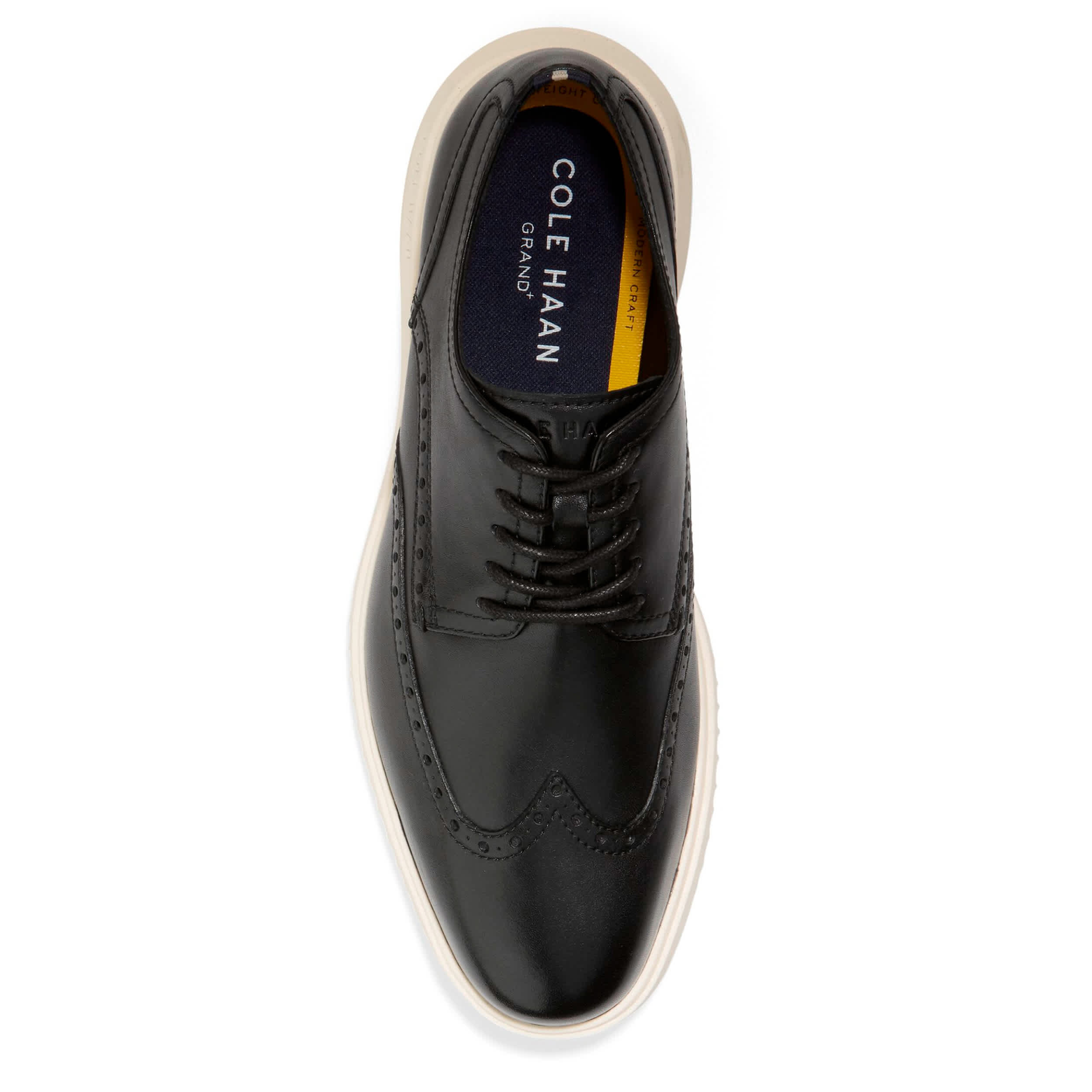 Just because you're walking, doesn't mean you can't look your best in the Cole Haan OriginalGrand Wingtip men's oxford. With a smooth leather upper featuring brogue accents for extra flair, this lace-up shoe has a natural flexibility and smart design. The EVA midsole & Grand.OS technology provide responsive cushioning that equals less fatigue.
