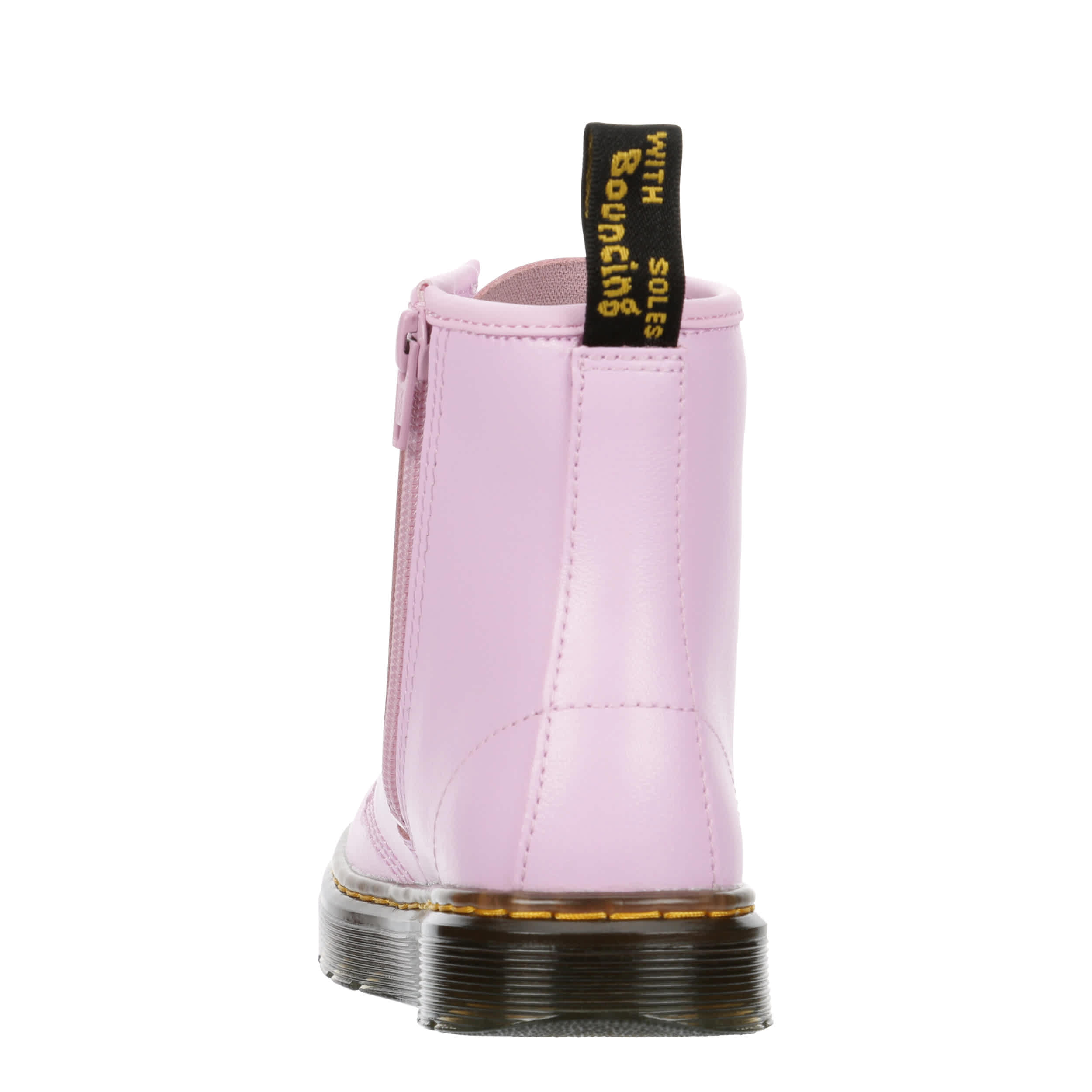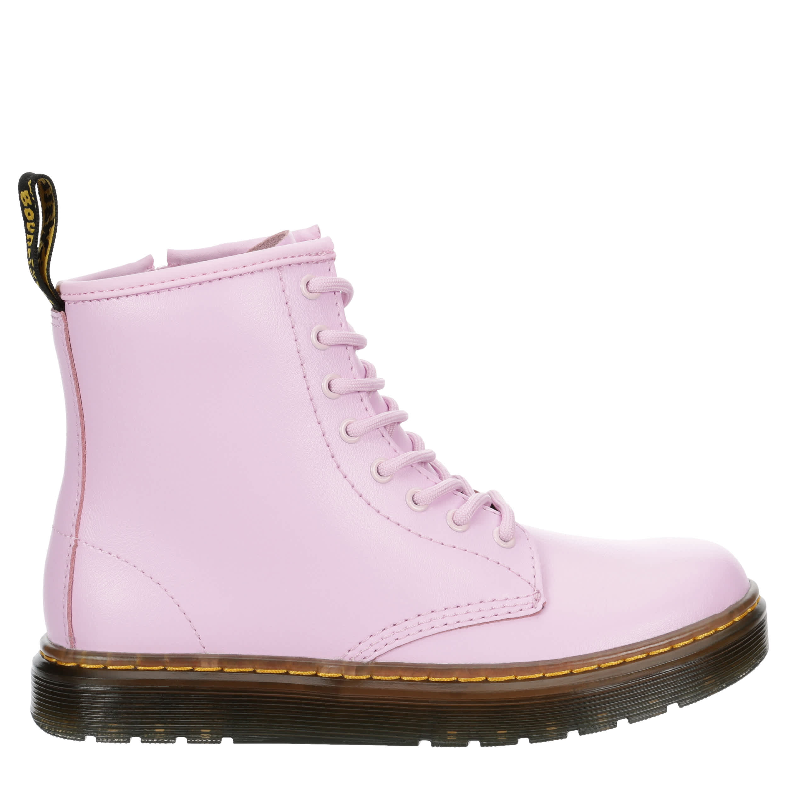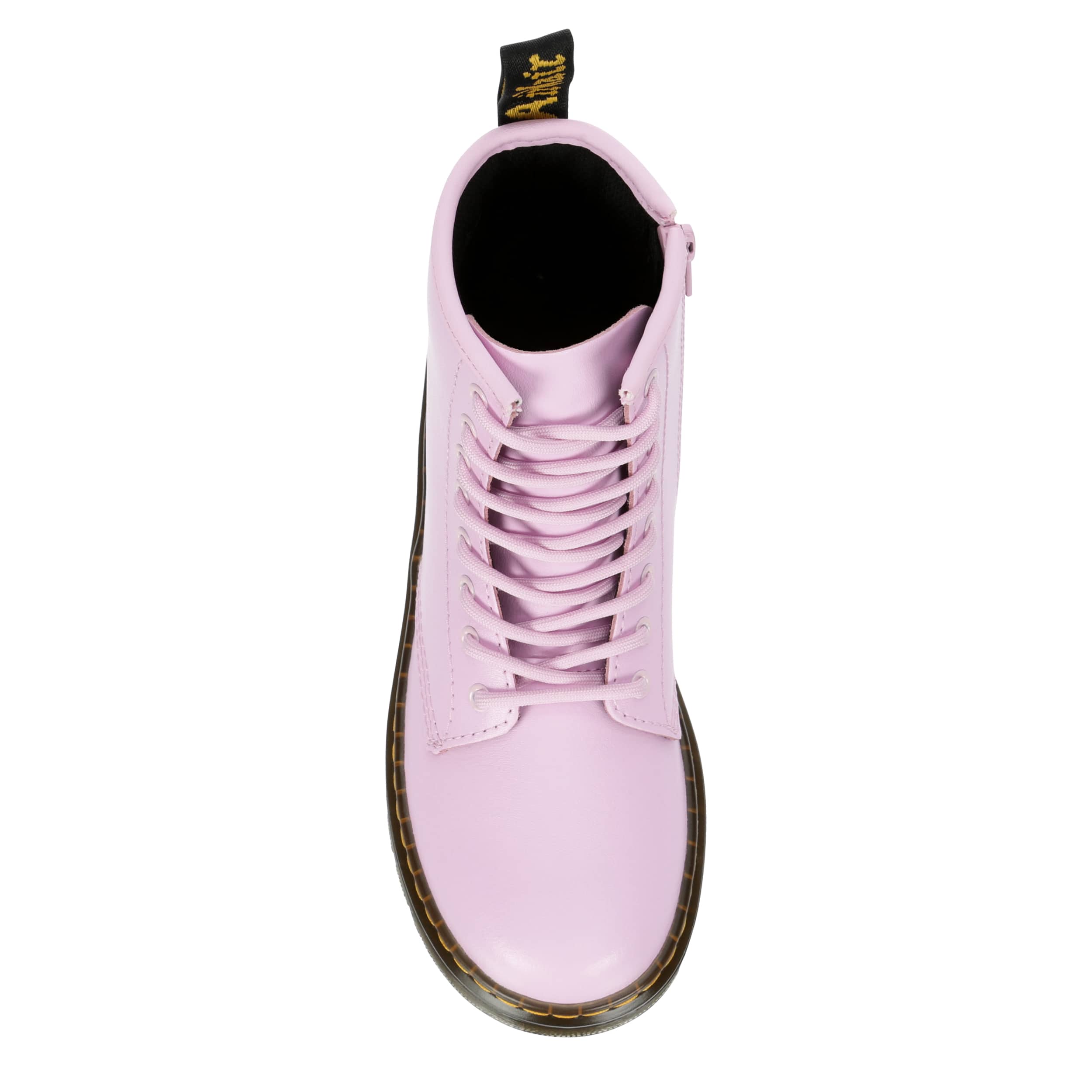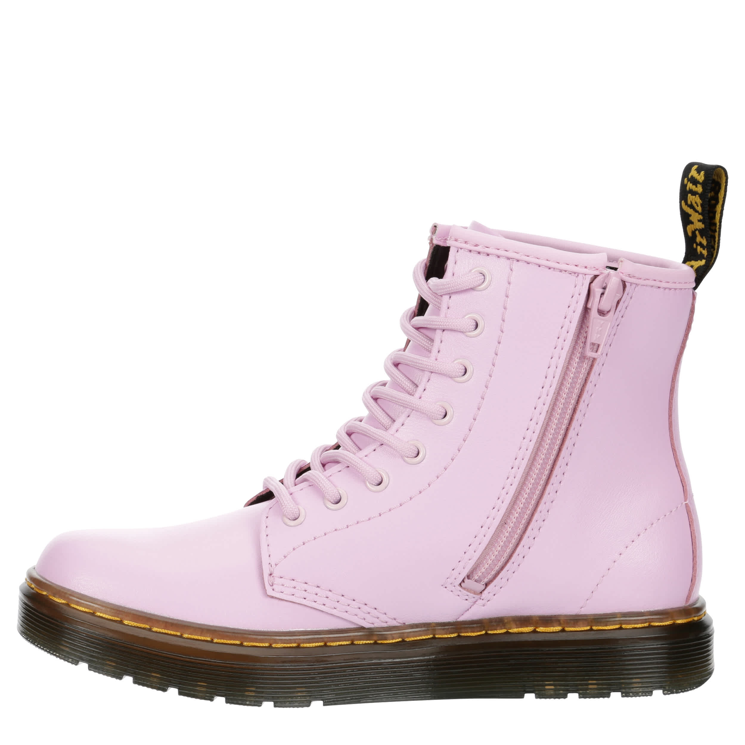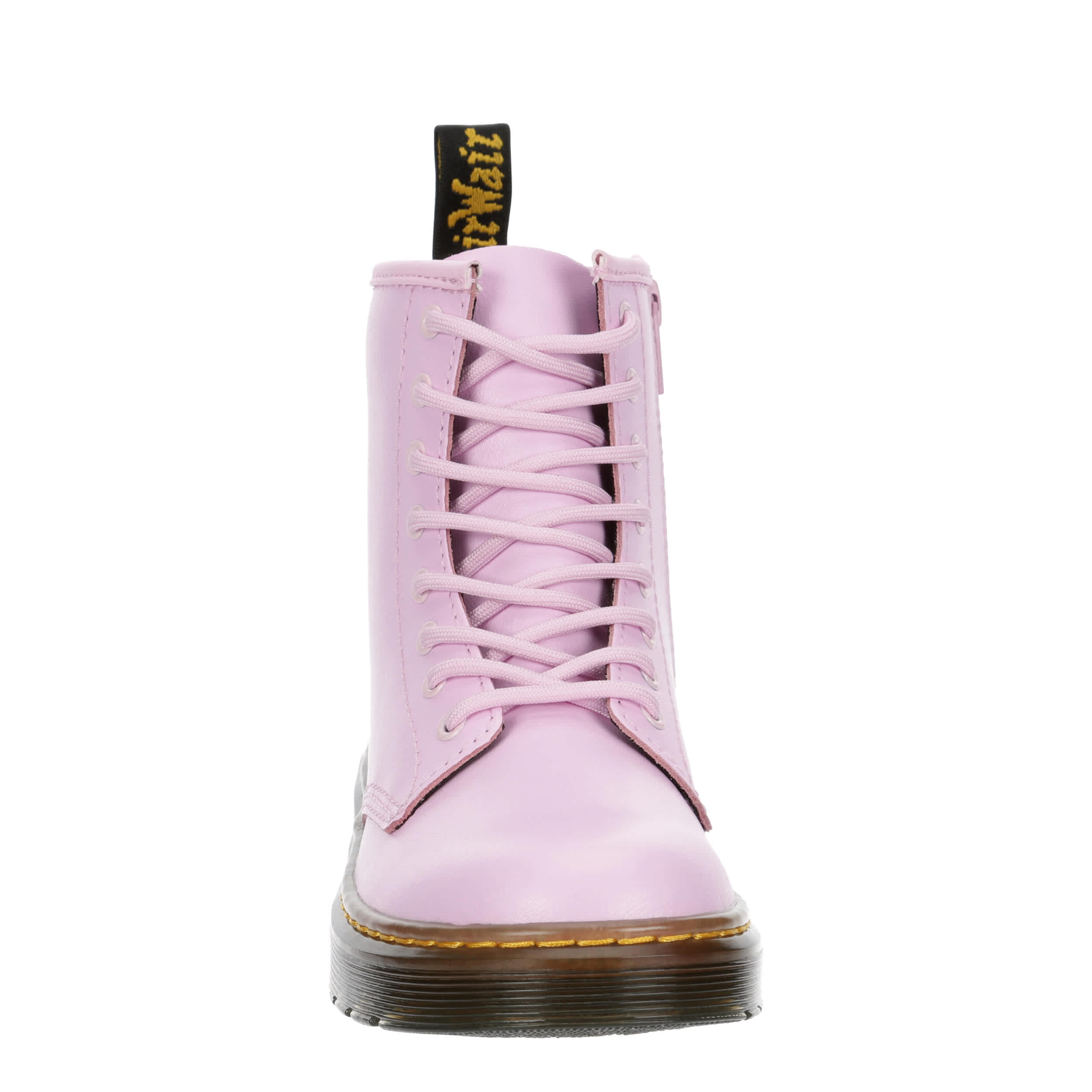 Let her show off her fun, edgy side in the Dr. Martens Zavala girls' combat boot. With a faux leather upper featuring the iconic yellow stitching and rear pull tab for easy entry, this inside zip boot has a traditional lace-up front. The insole cushions every step while that outsole adds more comfort and support.