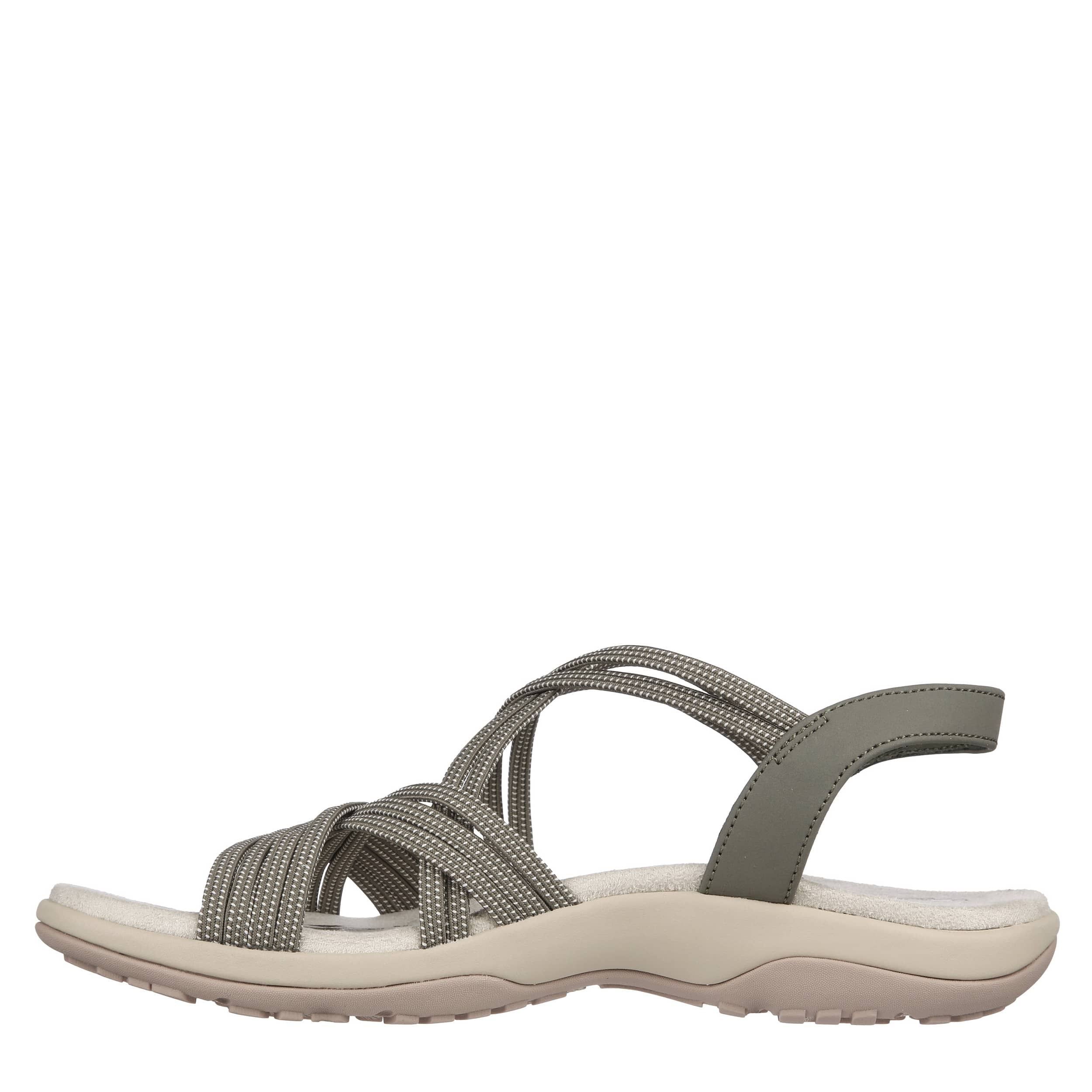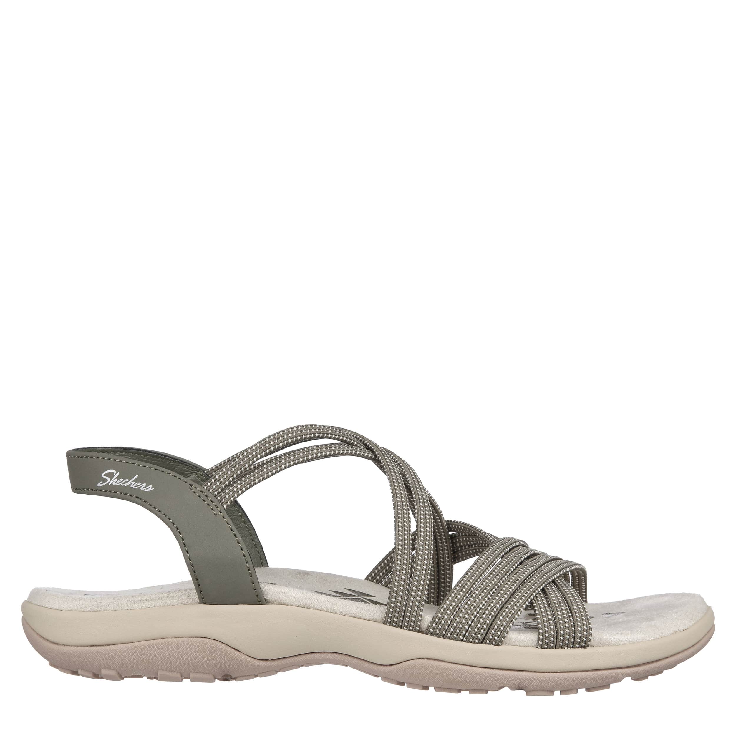 Easy-going style and comfort unite in the Skechers Modern Reggae Slim Takes Two women's sandal. Featuring a stretch fabric upper with sling-back strap closure for a secure fit, these sandals are ideal for casual walking and lounging around. The Skechers Memory Foamâ„¢ cushioned footbed soothes your foot with every step, while the flexible rubber traction outsole provides excellent support and stability.